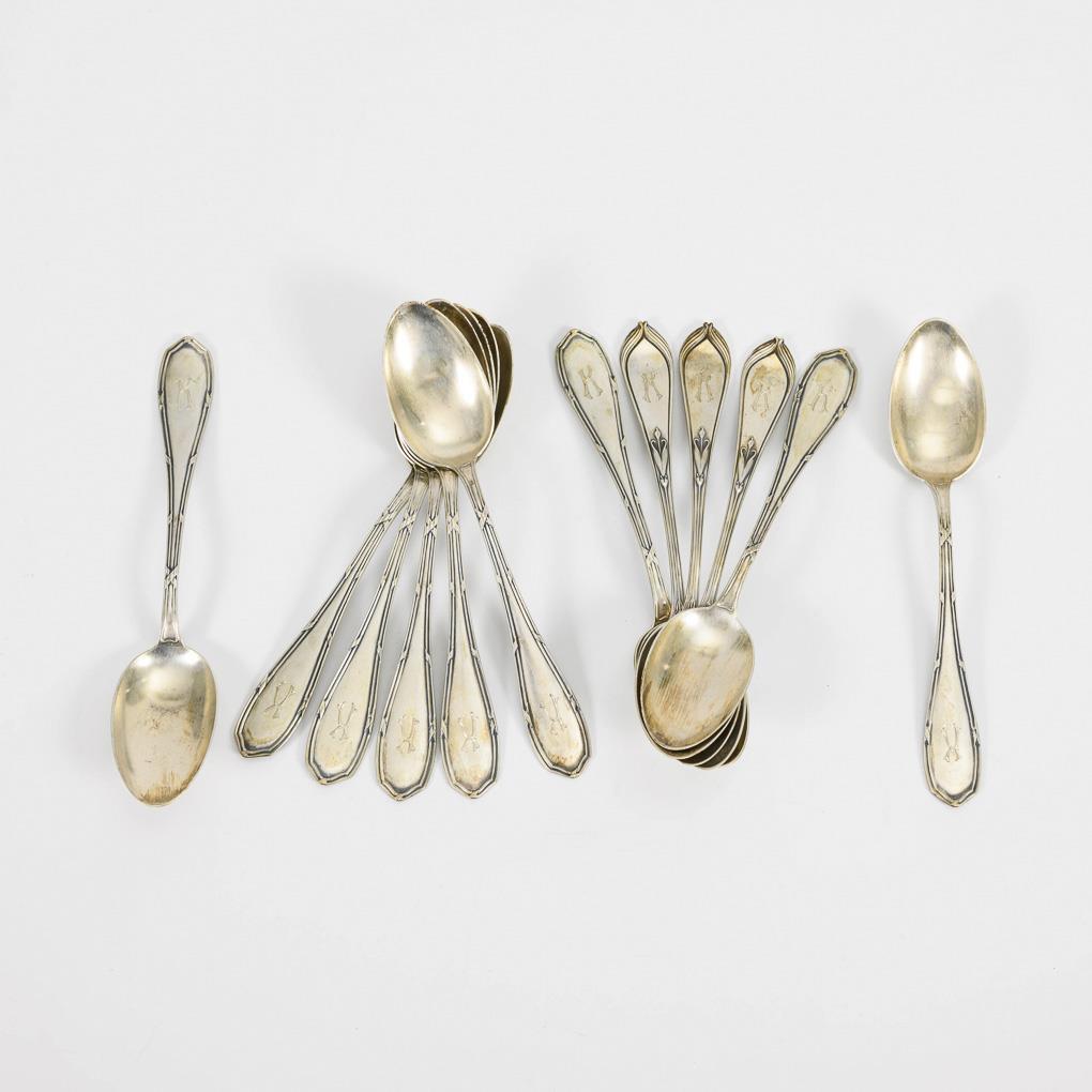 2 different decorations, all with monogram "K". 3x Art Nouveau, model 25600 "Bremer Lilie", design Hugo Leven. Koch & Bergfeld, Bremen / 8x with crossband edge. Vereinigte Silberwaren-Fabriken, Düsseldorf, with jeweler's stamp Th. Brederhorst. Signs of use.