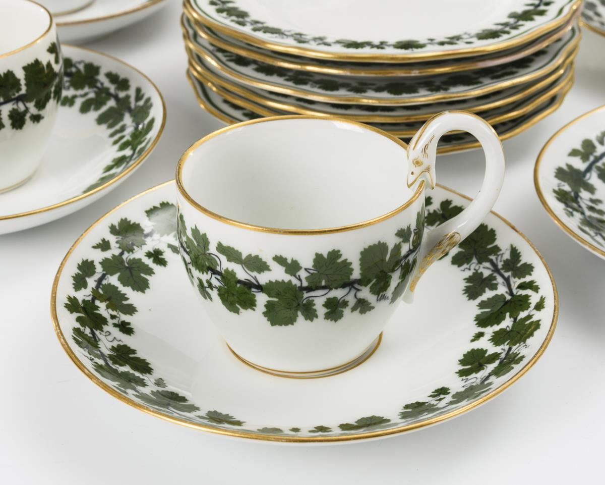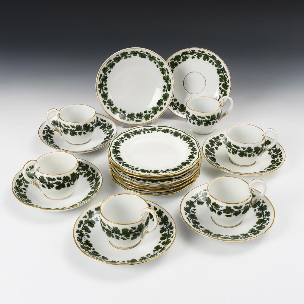 19 pieces. 6 swan-handled cups (h 8 cm). 6 plain saucers (Ø 15 cm) and 6 cake plates form "New cutout" (Ø 16 cm). Plus 1 Biedermeier saucer. 1 saucer and 1 cake plate with hairline crack, partial minimal gold wear, hairline crack in 1 saucer.