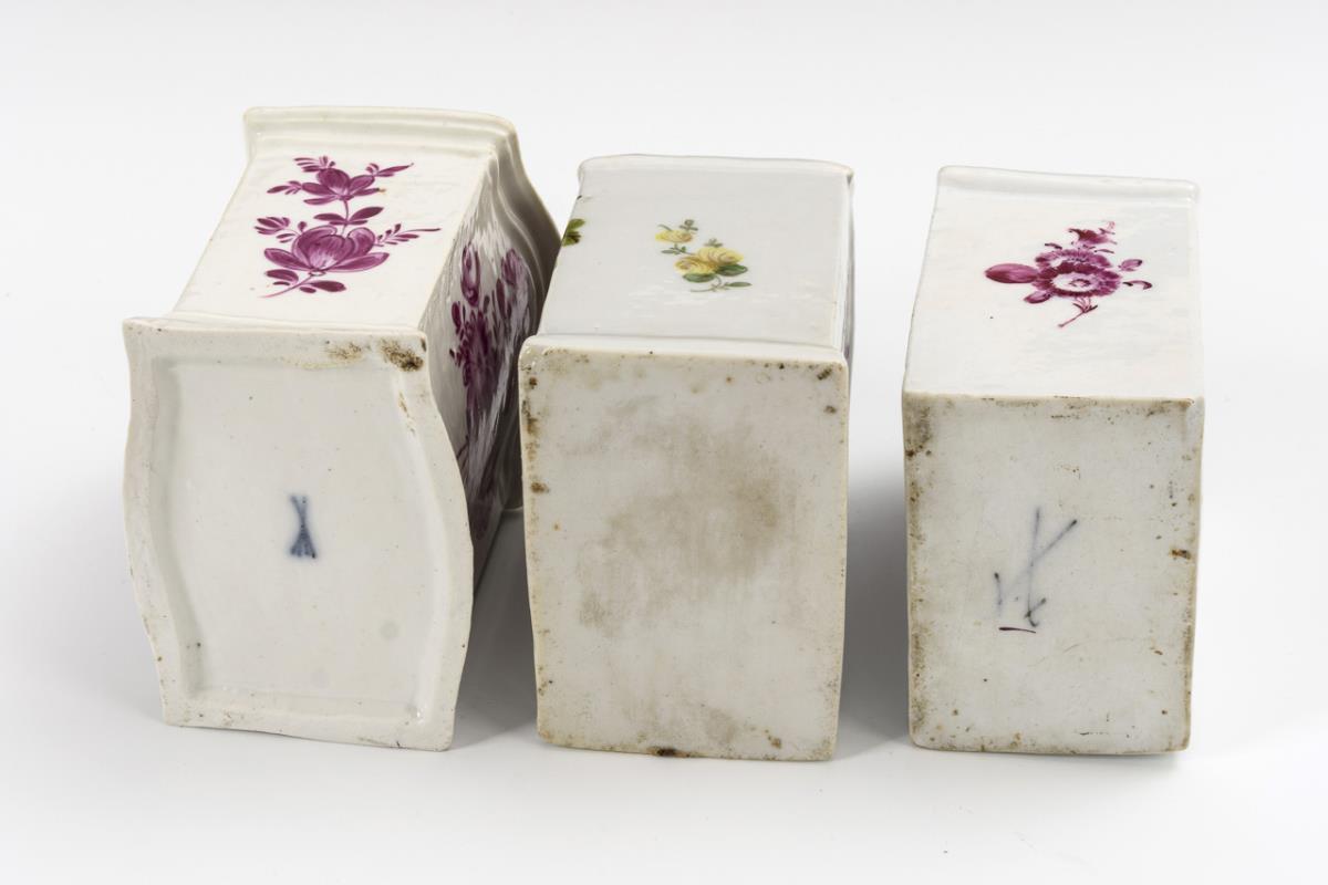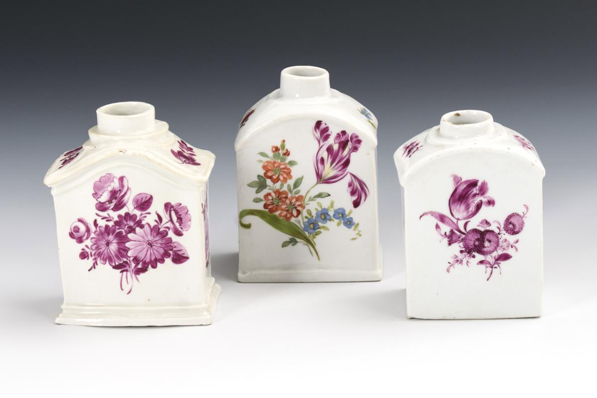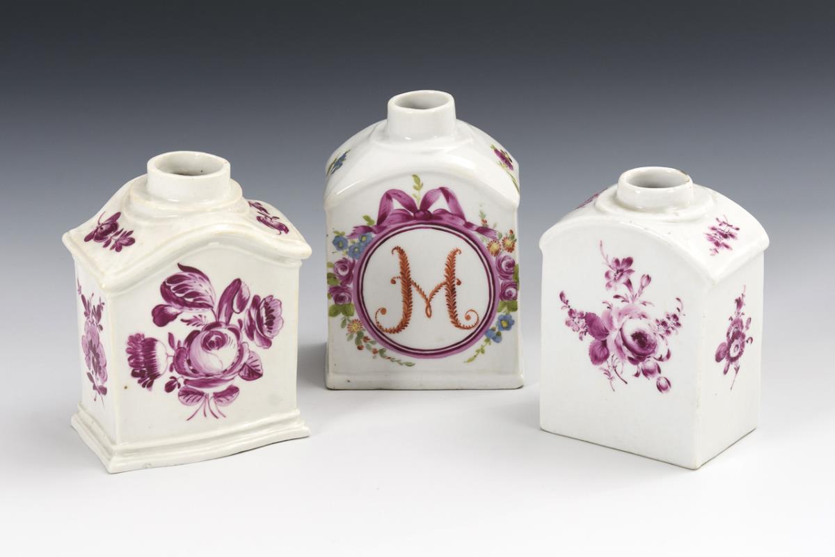 3 tea caddies (1x unmarked, 1x Meissen c. 1770 and 1x Aelteste Volkstedter c. 1770) with 2x purple floral painting and 1x with colored floral painting and the monogram "MH" on the front. / In addition, eye bowl and pipe bowl with iron-red painting. 1 tea caddy without lid, 1 tea caddy lid glued, 1Teedose with bump on the shoulder, hairline crack on the edge of the eye bowl.