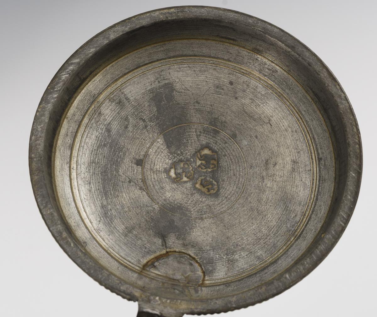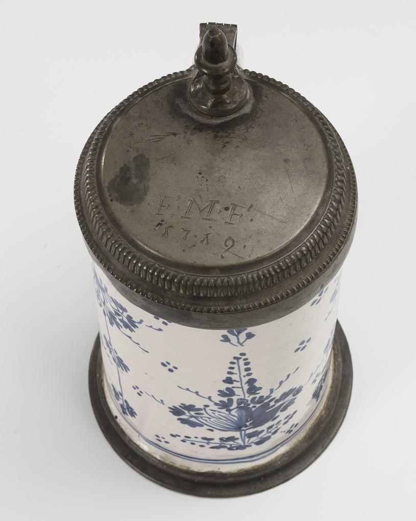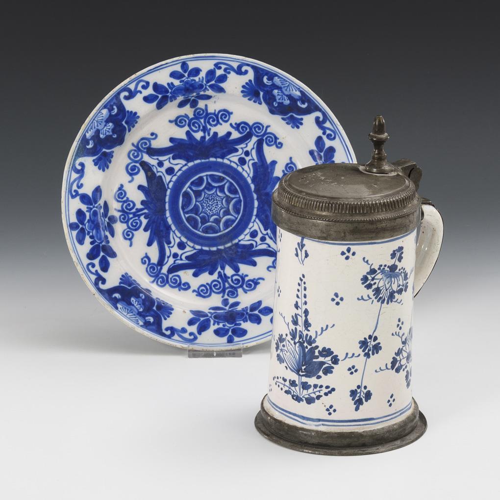 Cylindrical jug with ribbon handle and pewter mount, scattered floral painting all around, h 22 cm. Fluted plate with floral and spiral decoration, Ø 23 cm. Signs of age and use, some defects, plate restored at flag.