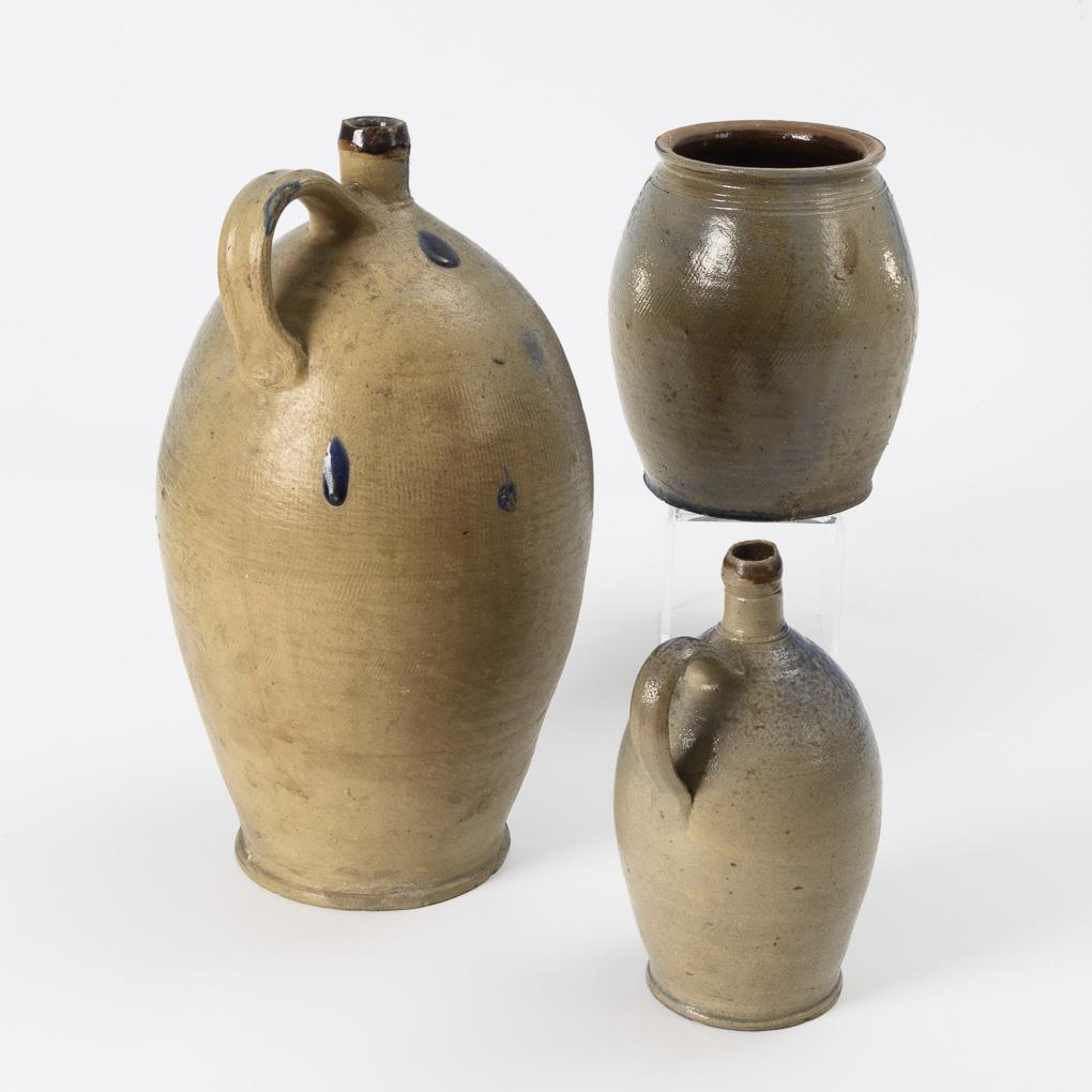 Grey salt-glazed stoneware with cobalt blue smalt throw, partly glazed in brown. H 22 cm to 36.5 cm.