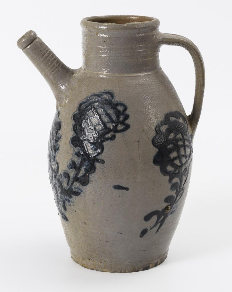 Grey and brown salt-glazed stoneware, partly painted cobalt blue.