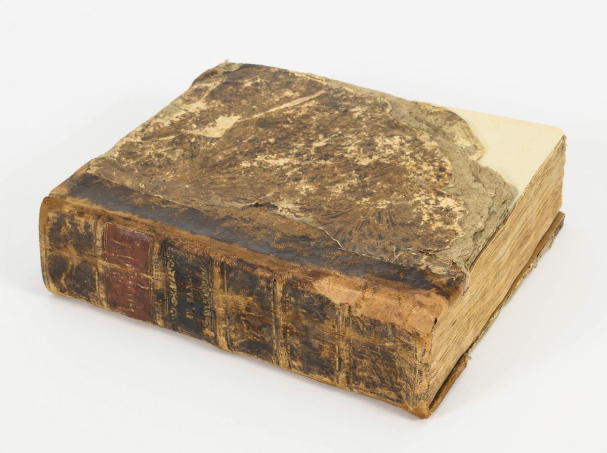 4th volume of 12. Colored illustrations of monkeys, water birds, fish, snakes, lizards, whales, caterpillars and butterflies, plants but also illustrations of Herculaneum, volcanoes, horse racing, Alpine telegraphy and much more. One colored copperplate page is usually accompanied by four pages of text with explanations in German, French, English and Italian. Not paginated throughout, but mixed by subject, but all belong to Volume 4. half leather binding. A larger corner of the cover is missing, signs of age and wear but tight binding, foxing.
