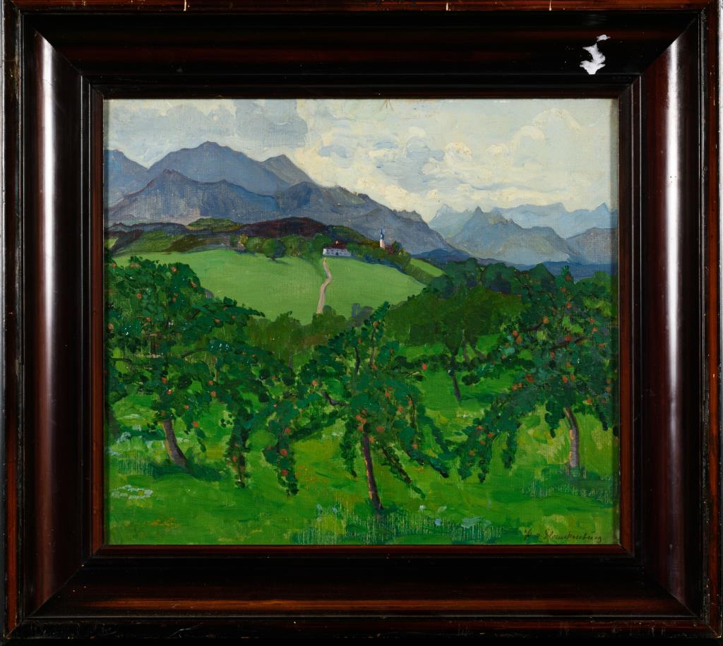 Farbkräftige Sommerlandschaft mit Obstbäumen auf grünen Wiesen im Gebirge.