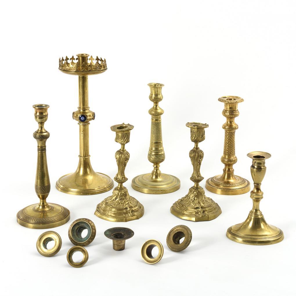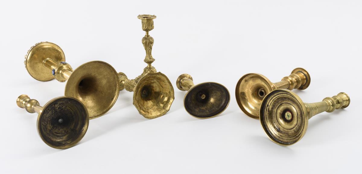 Pair of massive chandeliers richly decorated in relief in Baroque style. Biedermeier chandelier with fine relief friezes. Chandelier with oval base and stubby exorciser. Neo-Gothic chandelier made of brass with 4 enamel appliqués at the nodus and lily crenellation. 1 lily with solder repair, single grommets with signs of age/use.
