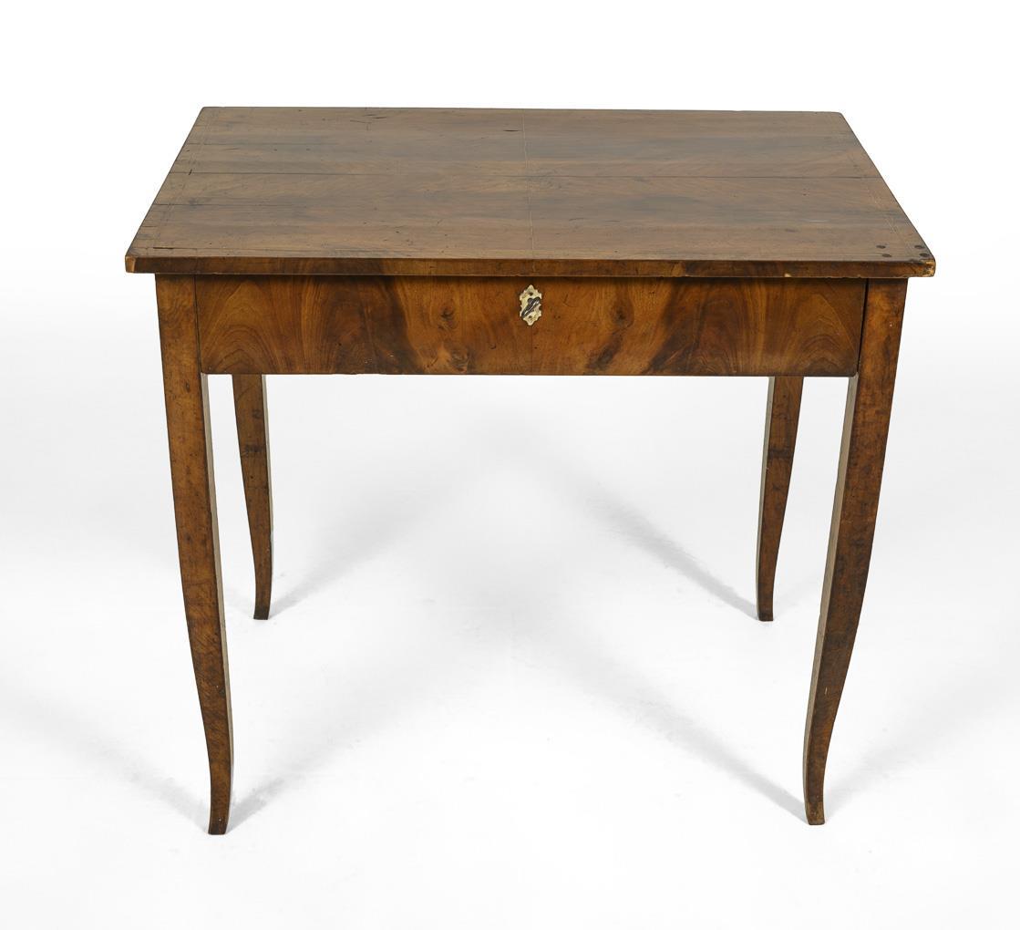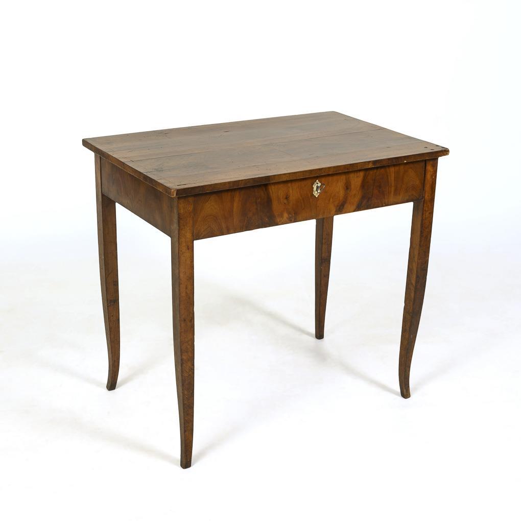Rectangular side table on 4 slightly flared pillar legs, 1 frame drawer. Signs of age/use, veneer bumped at corners, old restored.