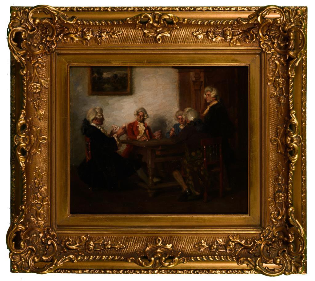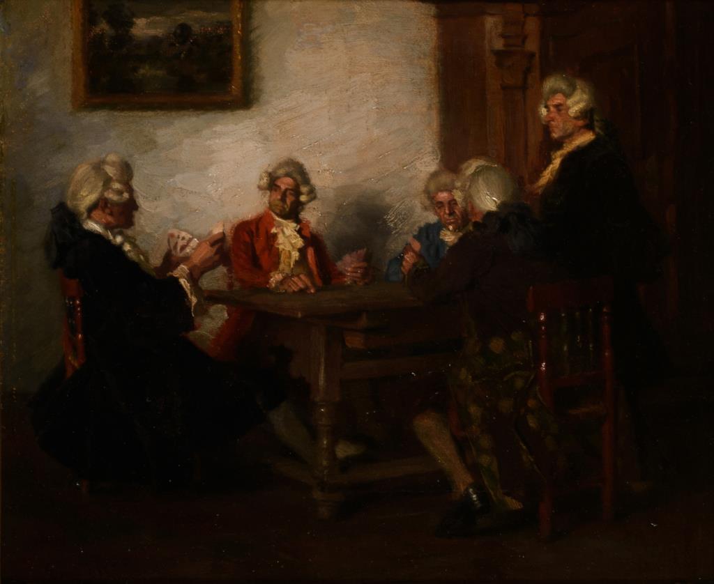Fünf Männer in der Kleidung des 18. Jahrhunderts beim Kartenspiel an einem Tisch.