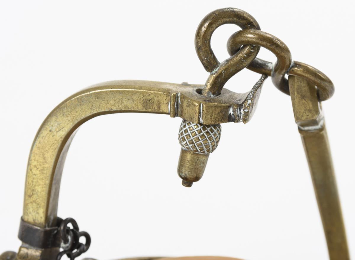 Baroque bronze chandelier with multi-pass foot and baluster stem. / Open frog with carrying hole cylinder, carrying hook and wick plate with engraving "1776" on the silver-plated rim support. / Pair of new candlesticks. Shield plate and hook tip of the frog missing. Baroque candlesticks: foot cracked several times, shaft base soldered, wax plate supplemented.