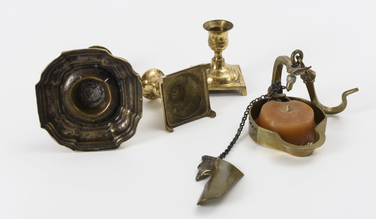 brass/bronze. H candlestick maximum 17.5 cm, L frog pot 11 cm.