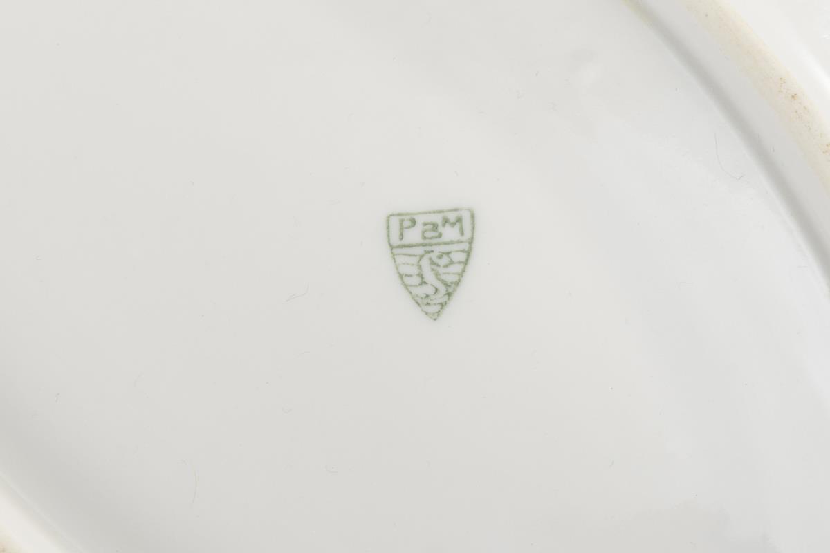 61 pieces. Decor "564" (previously referred to as "rose tendril decor"), shape "1909" (factory name "9" or "Smooth". Designer unknown. 20 dinner plates, 12 soup plates, 10 salad plates, 12 dessert plates, 4 oval plates (L 26.5, 34.5, 41 and 51.5 cm), 1 tureen (H 22 cm), 1 oval bowl (L 27 cm) and 1 sauce boat. Minimal bumping on the edge of the sauce boat, 1 dinner plate and 1 soup plate with hairline crack, 2 dinner plates, 1 dessert plate and 2 salad plates with edge chip, 1 soup plate with small edge bumping.