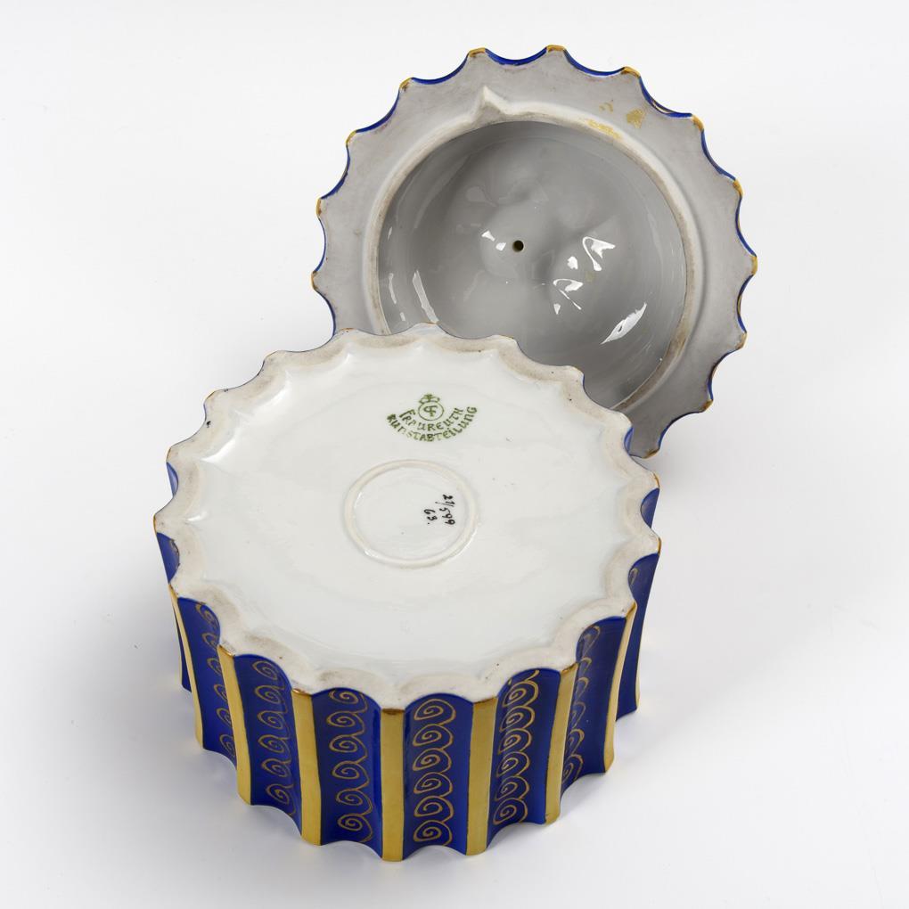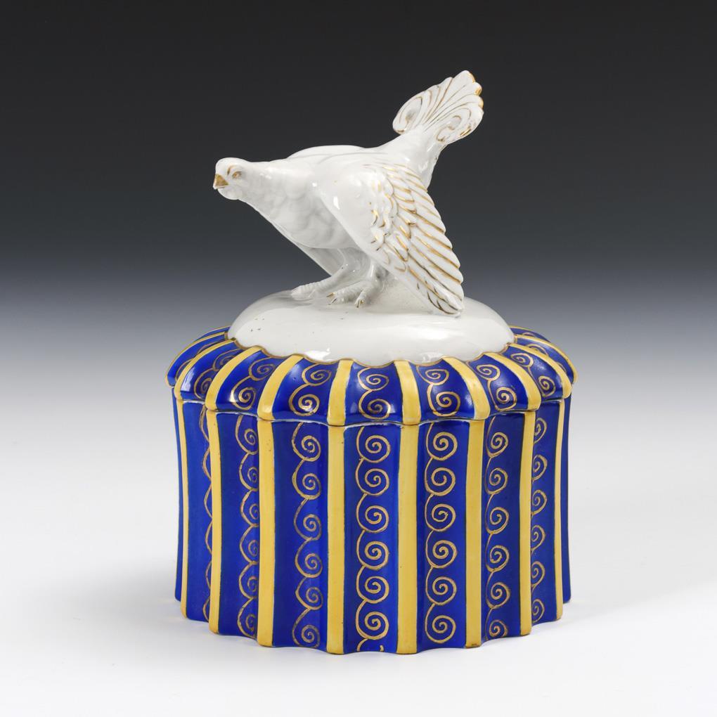 Cylindrical body with fluted walls, on the lid the plastic figure of a mating black grouse. Minimal gold abrasion, minimal bumping on the rim of the box.