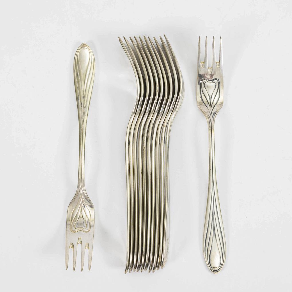 12 silver art nouveau fish forks. Bruckmann & Sons, Heilbronn.