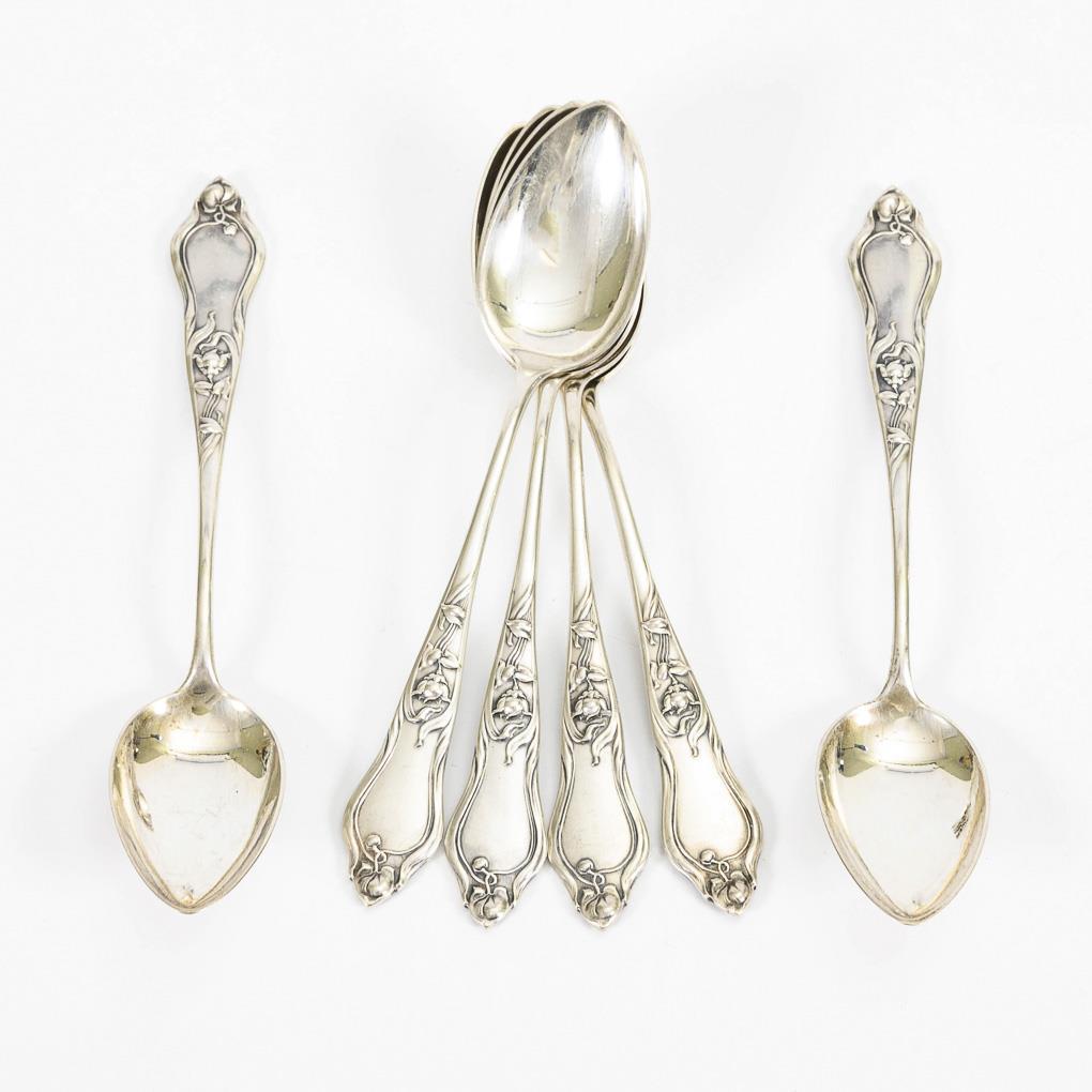6 Art Nouveau coffee spoons in case. Lutz & Weiss, Pforzheim.