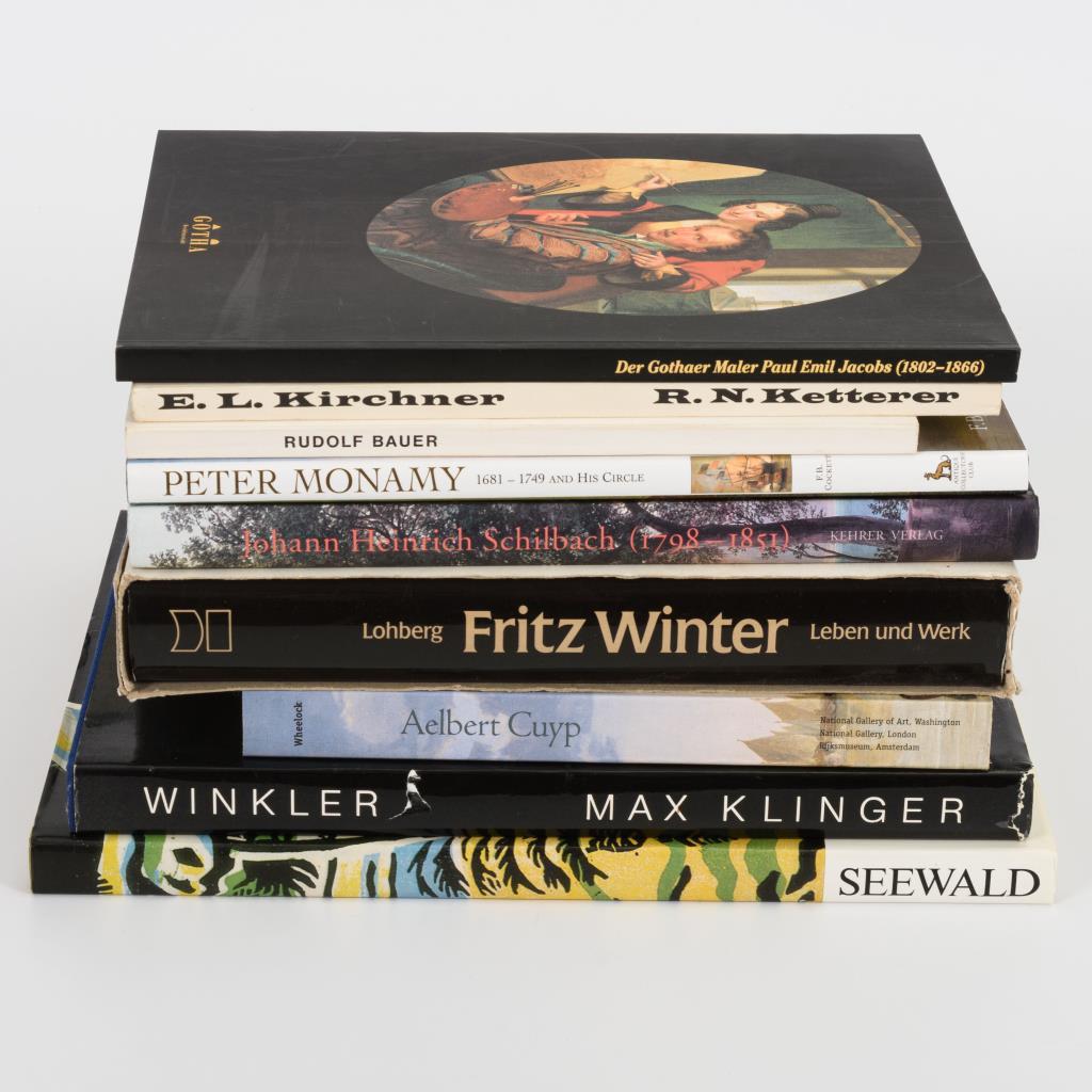 Winkler, Gerhard: "Max Klinger", Leipzig 1984, 308 Seiten. / Sailer, Anton: "Seewald - eine Werkauswahl mit zeitgenössischen Würdigungen und Zitaten aus Büchern von Richard Seewald", München 1977, 228 Seiten. / Lohberg, Gabriel: "Fritz Winter, Leben und Werk mit Werksverzeichnis der Gemälde und einem Anhang der sonstigen Technik", München 1986, 532 Seiten. / Märker, Peter: "Johann Heinrich Schillbach 1798 - 1851, der Traum vom Süden, Zeichnungen, Aquarelle, Ölstudien und Gemälde", Heidelberg 2000, 207 Seiten. / Cockett, F.B.: "Peter Monamy 1681 - 1749 and his circle". England 2000, 119 Seiten. / "Der Gothaer Maler Paul Emil Jacobs (1802 - 1866), ein Künstler zwischen Klassizismus und Spätromantik", Ausstellungskatalog Schloß Friedenstein Gotha 2002, 128 Seiten. Broschur. / Wheelock jr., Arthur K.: "Aelbert Cuyp", Washington 2001, 320 Seiten, Broschur. / "Rudolf Bauer" Ausstellung in der Galerie Gmurzynska, Köln 1973, 109 Seiten, Broschur. / "Das Werk Ernst Ludwig Kirchners , Malerei, Grafik, Plastik, Zeichnungen", Ausstellungskatalog Galerie Roman Norbert Ketterer, Campione 1980, 168 Seiten, Broschur. Alle mit zahlreichen farbigen Abbildungen, wenn nicht anders vermerkt im festen Einband, kaum Gebrauchsspuren.