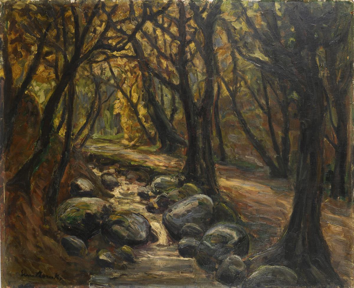 Narrow stream between densely standing trees. Slight signs of age.