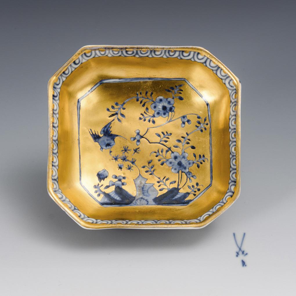 Baroque bowl with blue painting and gold background. Meissen.