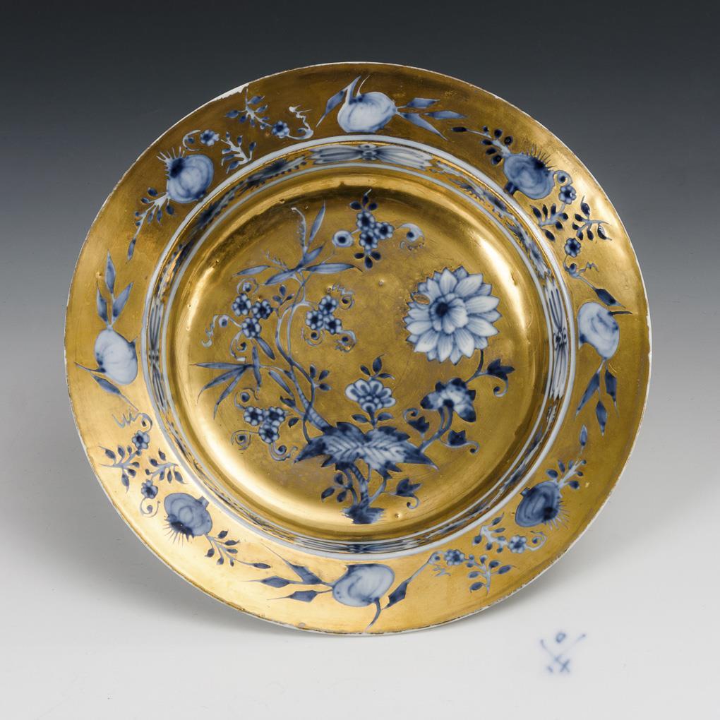 Soup plate with underglaze blue painted onion pattern and gold background. Gold somewhat rubbed, stand ring minimally bumped.