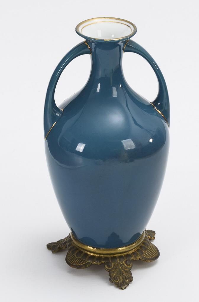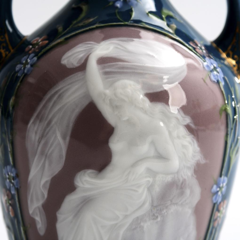 Baluster vase with two arched handles and bronze mounted foot. Blue background, on the front a medallion framed by relief painted flowers with brownish background and depicting a young woman leaning on the rock with naked torso and cloth drapery. Minimal gold abrasion on the rim.