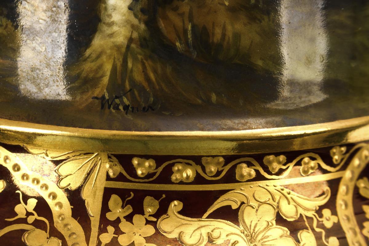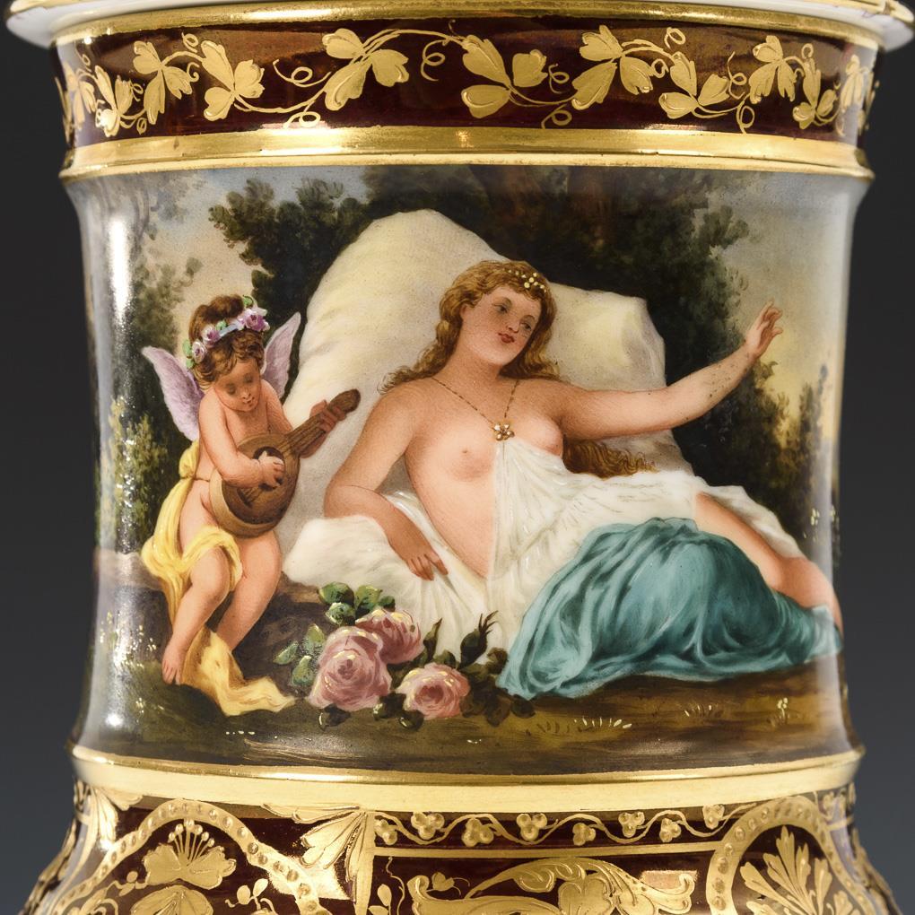 Cylindrical body with depressed bulbous base, knobbed lid, nodded stem, round foot. Bordeaux colored voluptuous base with rich floral ornamental gold relief painting. Circumferentially depicting an allegory on music with a muse reclining in a vast landscape, dressed by a lute-playing putto, inscribed on the underside. Pommel restored.