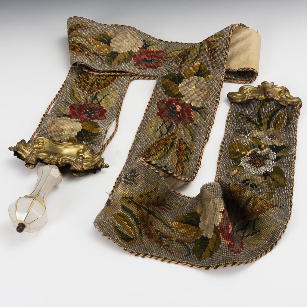 Gold-stamped glass, embossed brass sheet, fully embroidered (partly with glass beads) drawstring. L total 216 cm.