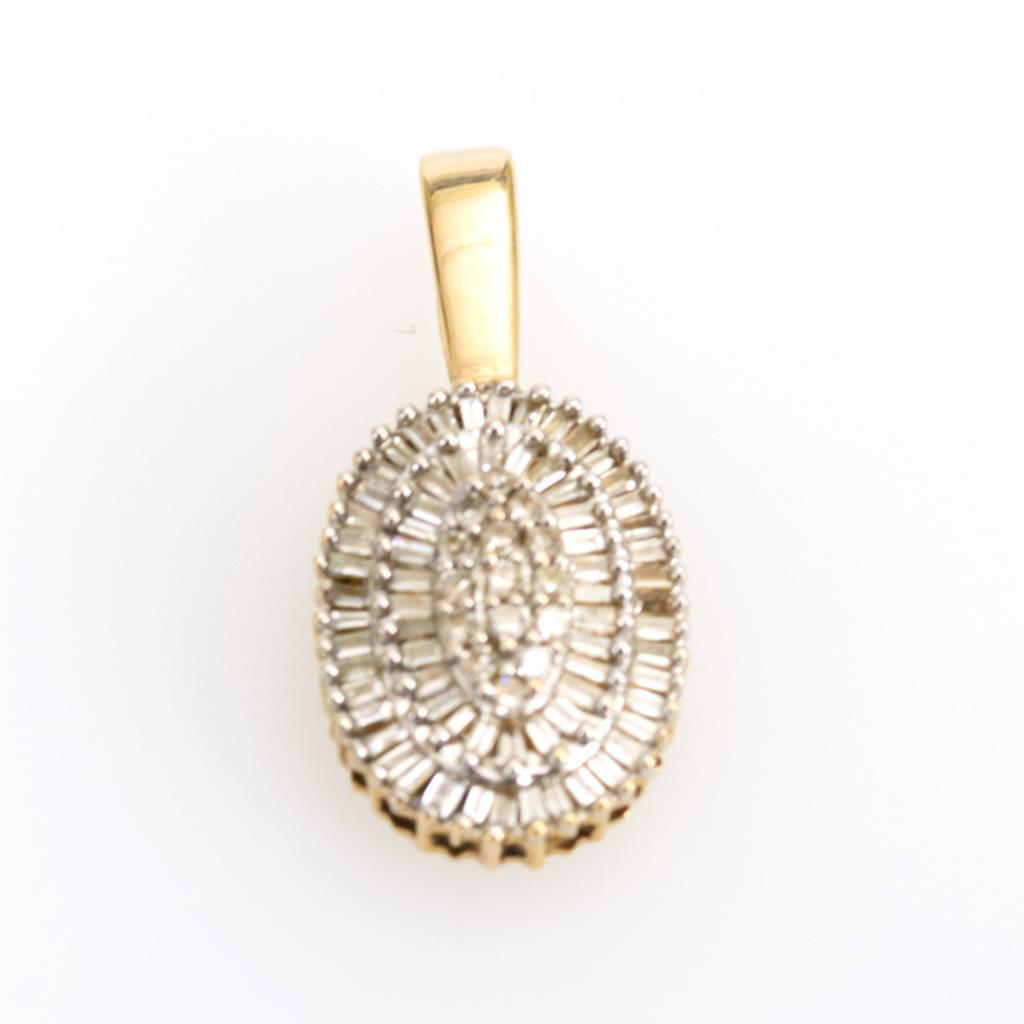 Anhänger mit kleinen, eingelassenen Diamanten und strahlenförmig gefassten Baguett-Diamanten, an starrer Klippöse.