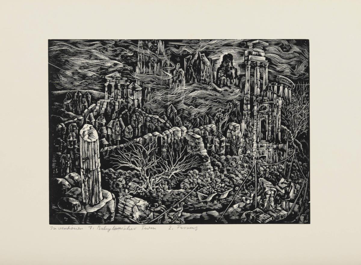 Sequence of 9 wood engravings "Inventions": "Title", "Above the City", "Hope", "Female Figures" (I. and II. version), "Babylonian Tower" (I. and II. version), "4 Elements" and "Messembria". Sheet margins slightly browned.