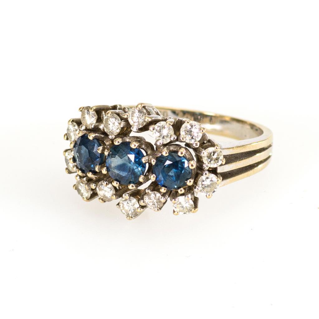 3 Saphire, umgeben von 14 kleinen Diamanten. Schmale Schiene.
