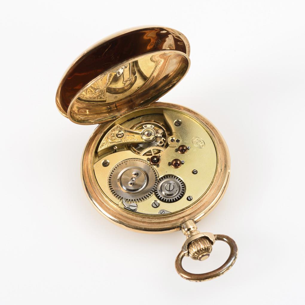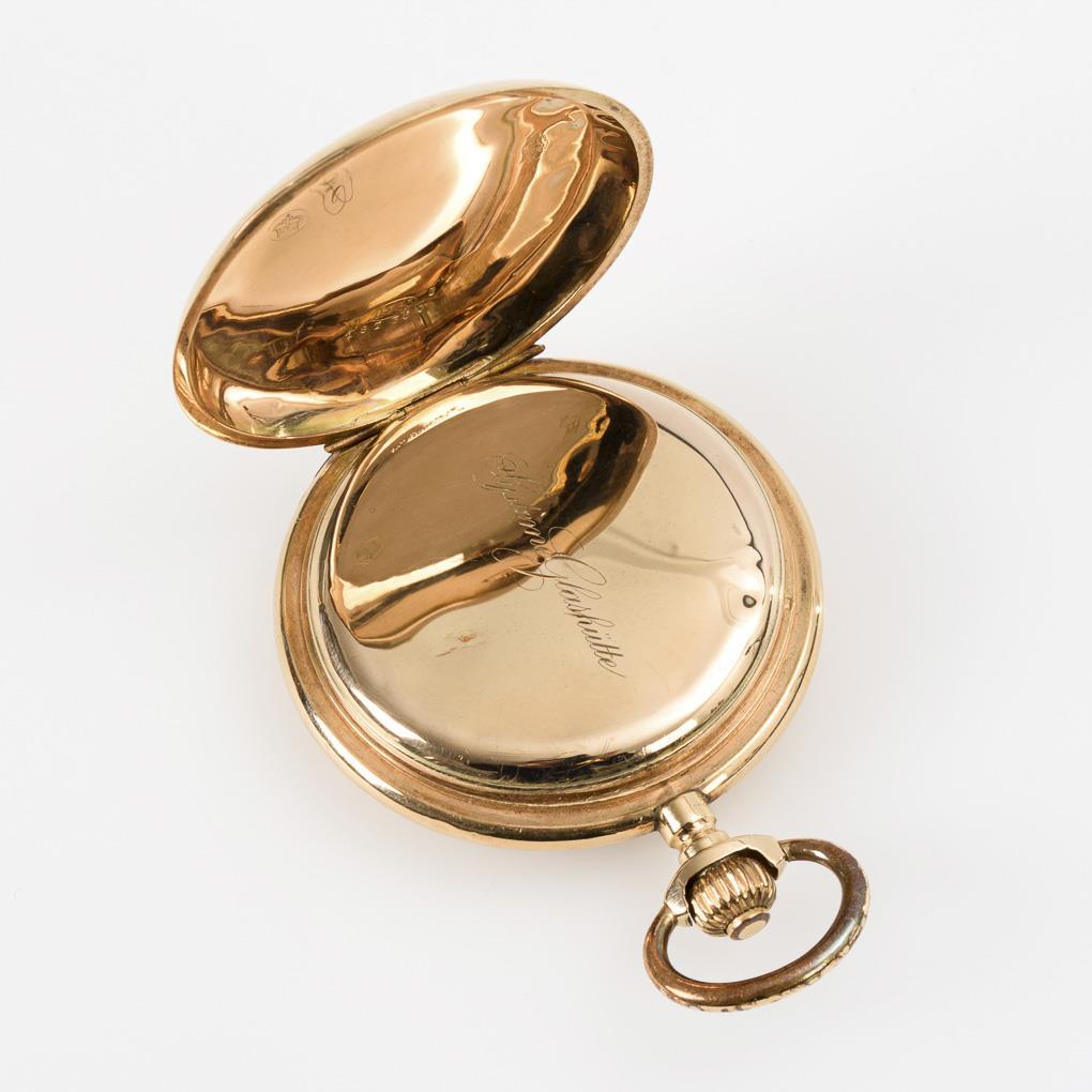 585 hallmarked, Swiss hallmark, hallmark of fineness, company mark, gold dust cover marked "Système Glashütte". Ø 5,3 cm. 96 g.