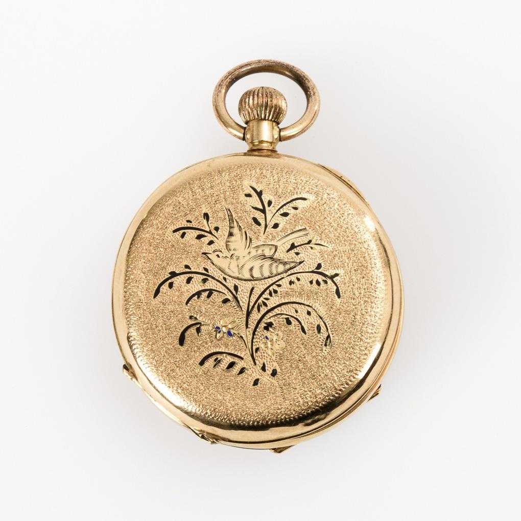 Chased case with flower branch and little bird in black and blue enamel. Case slightly dented, enamel partially defective.