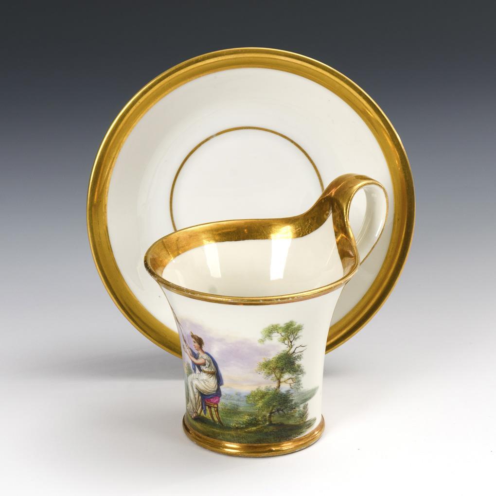 Polychrome painted, gold decorated. H cup 9.5 cm, Ø supplemented saucer 13.5 cm.