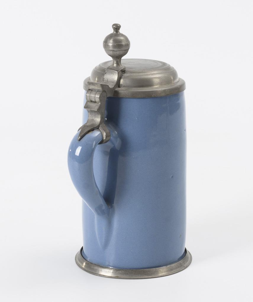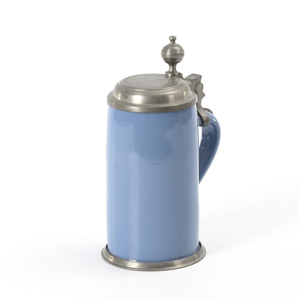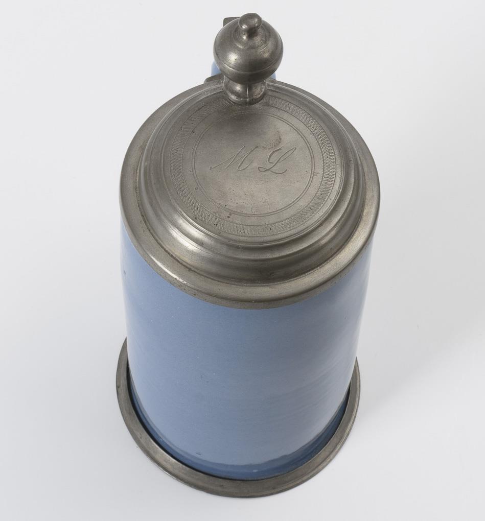 Dove blue glazed cylindrical jug with ribbon handle. Profiled pewter lid with ball pusher engraved "ML", pewter stand ring.