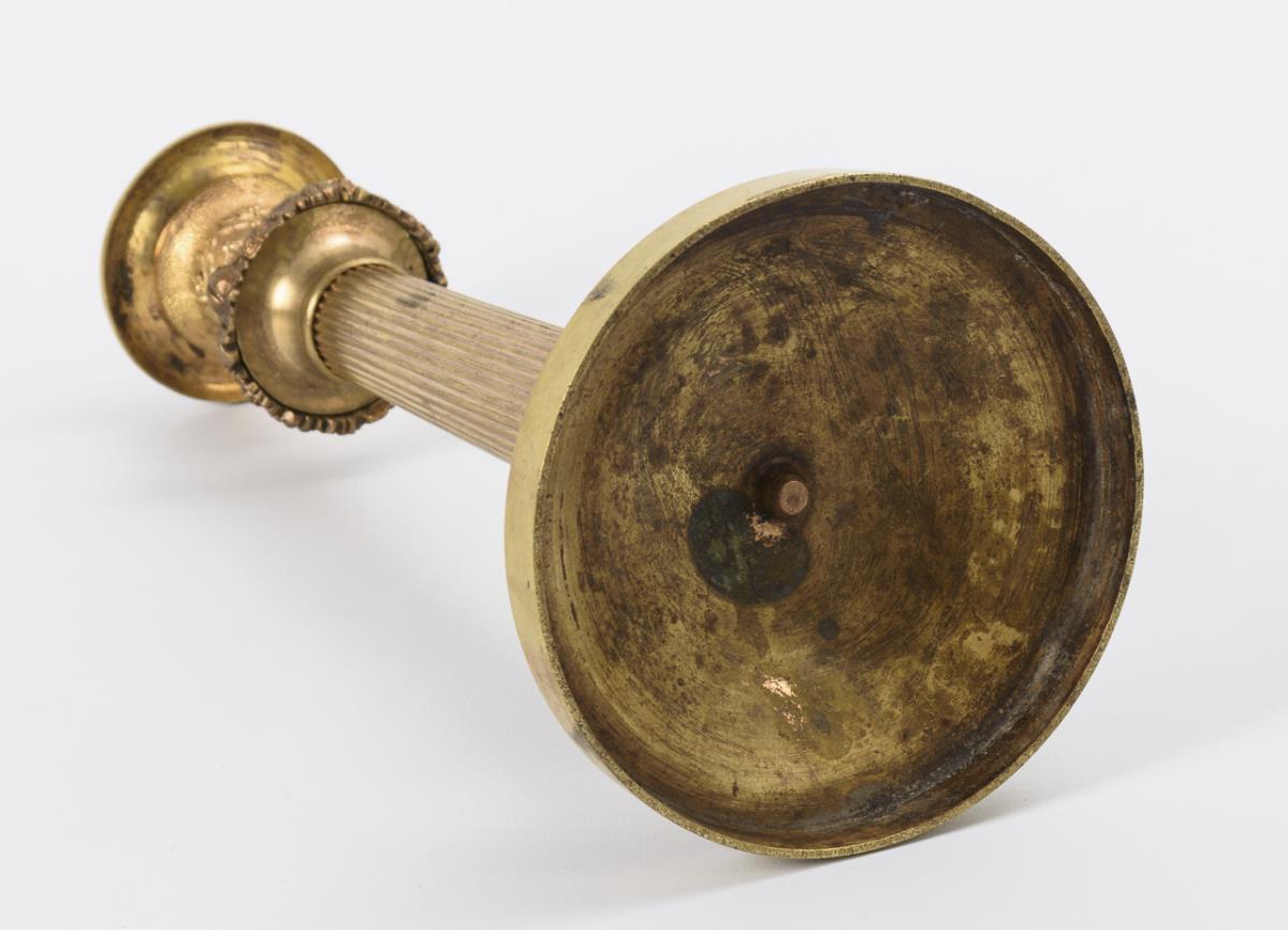 Round base and stem base with acanthus relief, fluted stem, relief capital with vine/corymb/flower and vase spout with floral relief