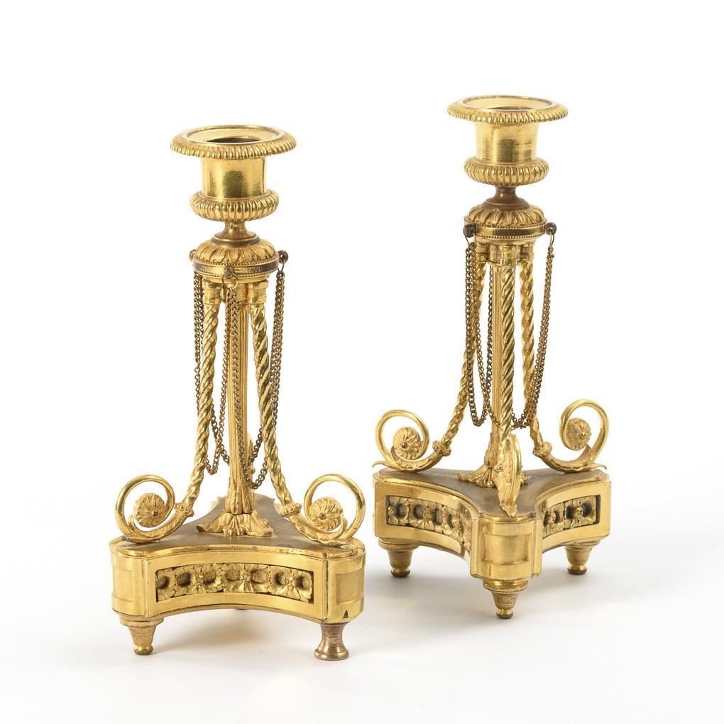 3-sided base with relief appliqués, central shaft with 3 twisted accompanying volutes and 3 decorative chains and vase crowning. Minimal signs of age / use.