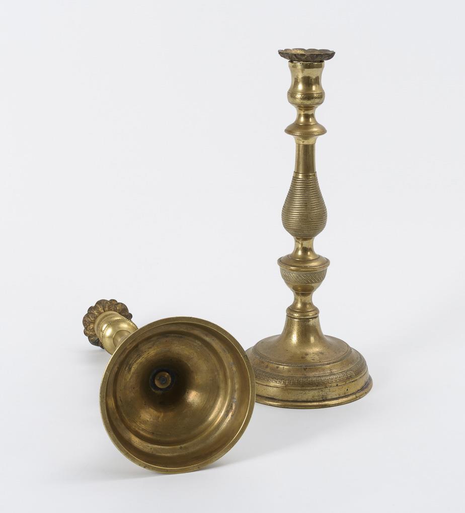Large heavy bronze candlesticks each with fine ornamental friezes on the high round feet, on the baluster stem as well as on the vase spout. Few signs of age/use.