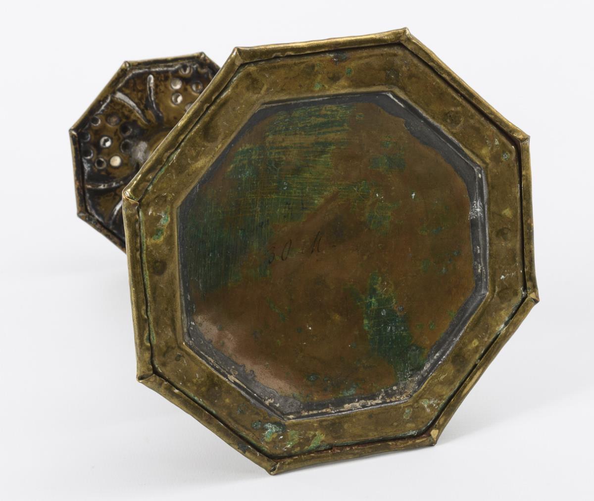 So-called wedding candelabra with octagonal foot, collar and wax plate and ornamented column shaft. Dents on the foot, solder repair on the wax plate barely visible.