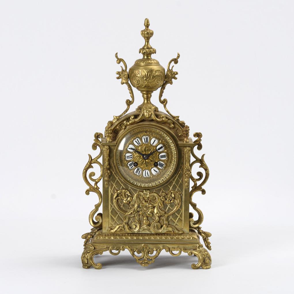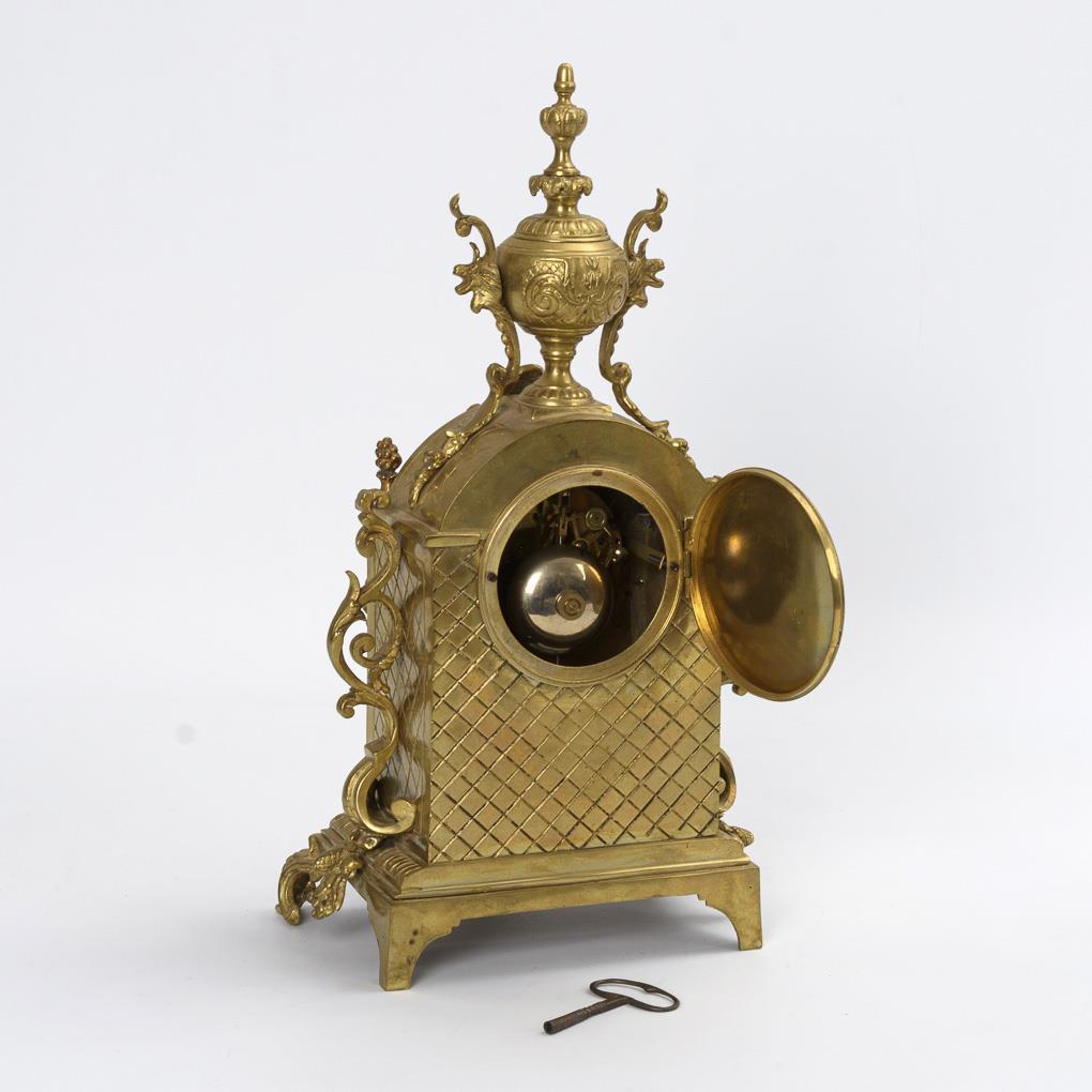 Historistic pendulum with architectural round arch case, vase crowning and decorative applications. Slight signs of age, movement cover not closing properly.