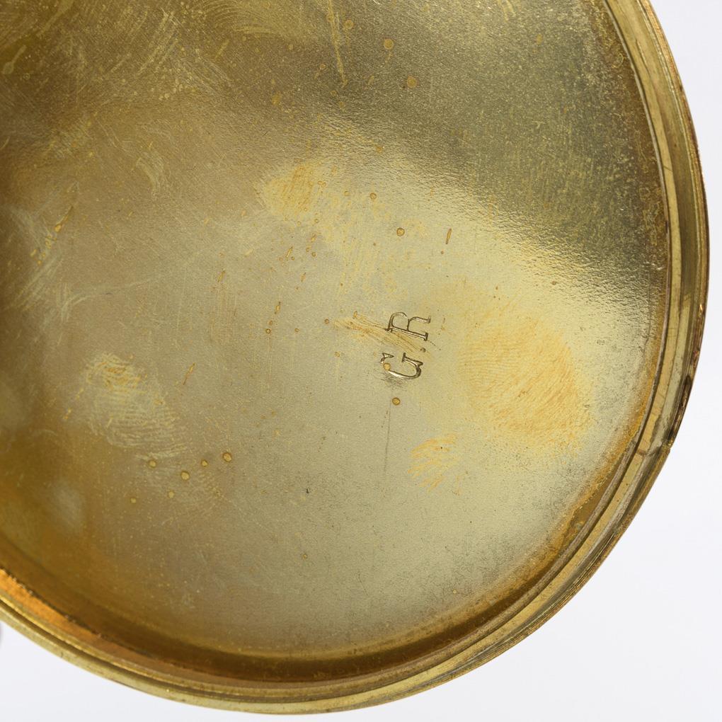 Market movement with half-hour strike on bell, running. Domed glazed dial with white enamel reserves and black Roman numerals, minute crown and Romaines hands.