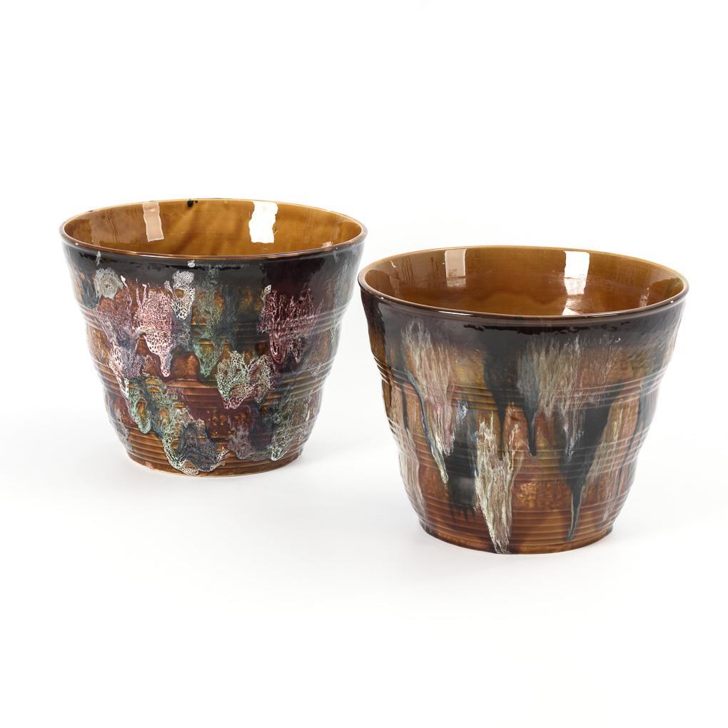 2 majolica cachepots with running glazes. Faienceries de Sarreguemines.