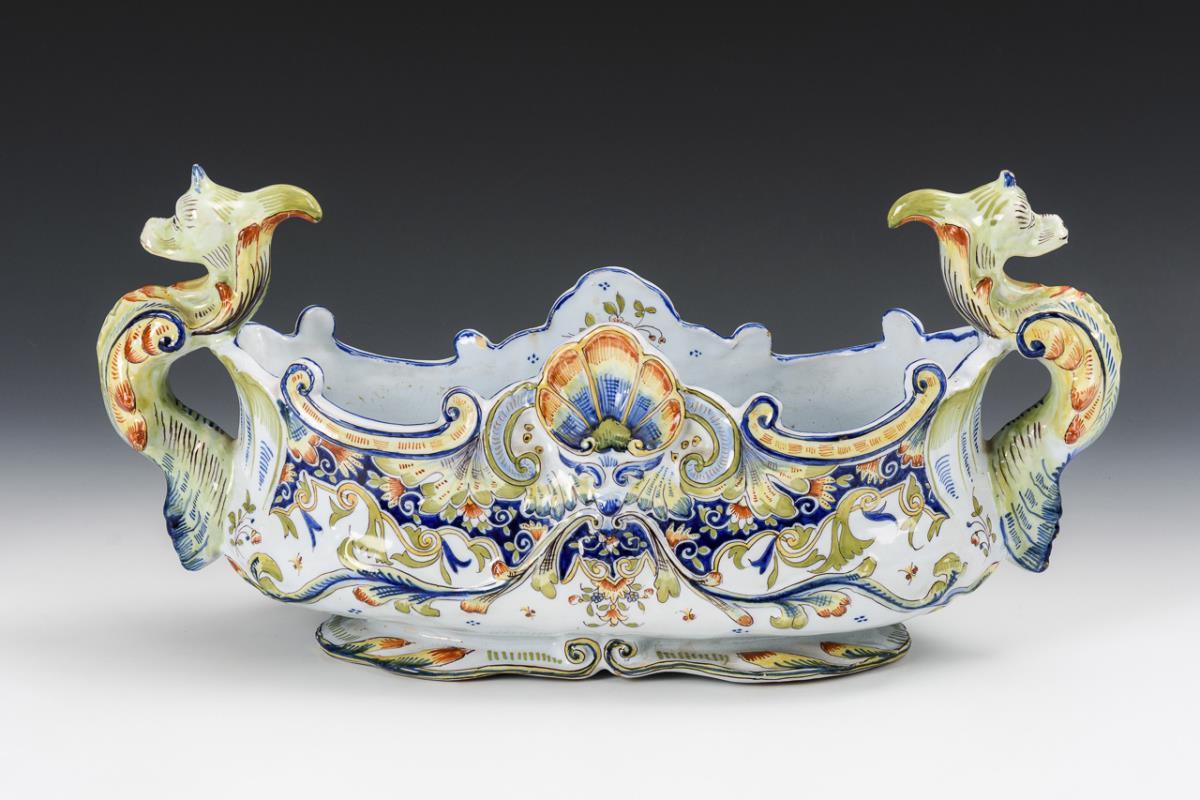 Fayence jardinière with dragon handles.