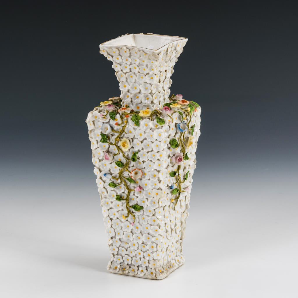 Quadratische Balustervase mit Kraterhals. Dicht mit Blüten und Rosenranken belegt. Bestoßungen an den Blüten.