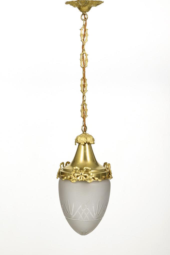 1-light ceiling lamp on chain suspension with palmette canopy and bell-shaped holder with bow decoration; oval lampshade. Light signs of age/use, glass rim with small chips.