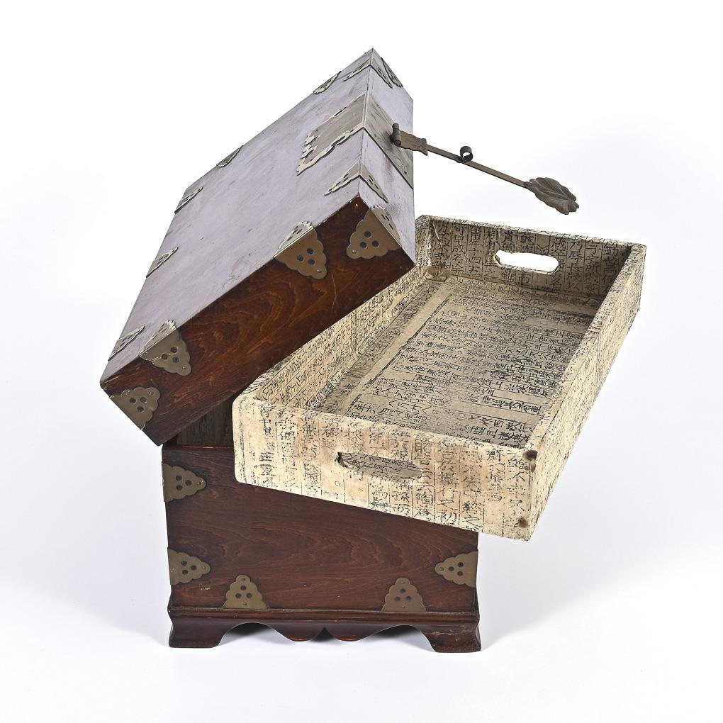 Rectangular body with metal fittings. Interior and insert completely covered with printed paper.