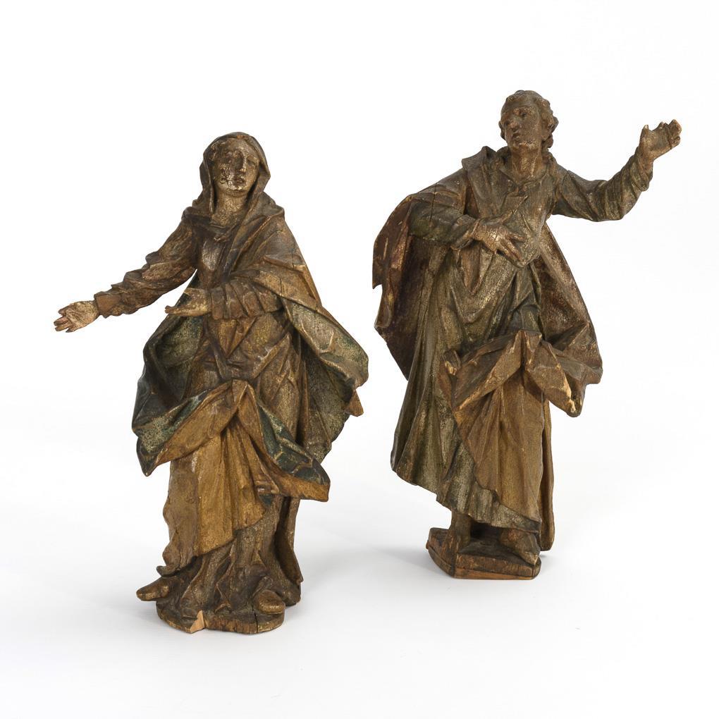 High quality carved fully plastic standing figures (Mary and John?) with expressive gestures and exceedingly wrinkled robes. Missing parts, minor additions, partly dry cracks, strong signs of age / use.
