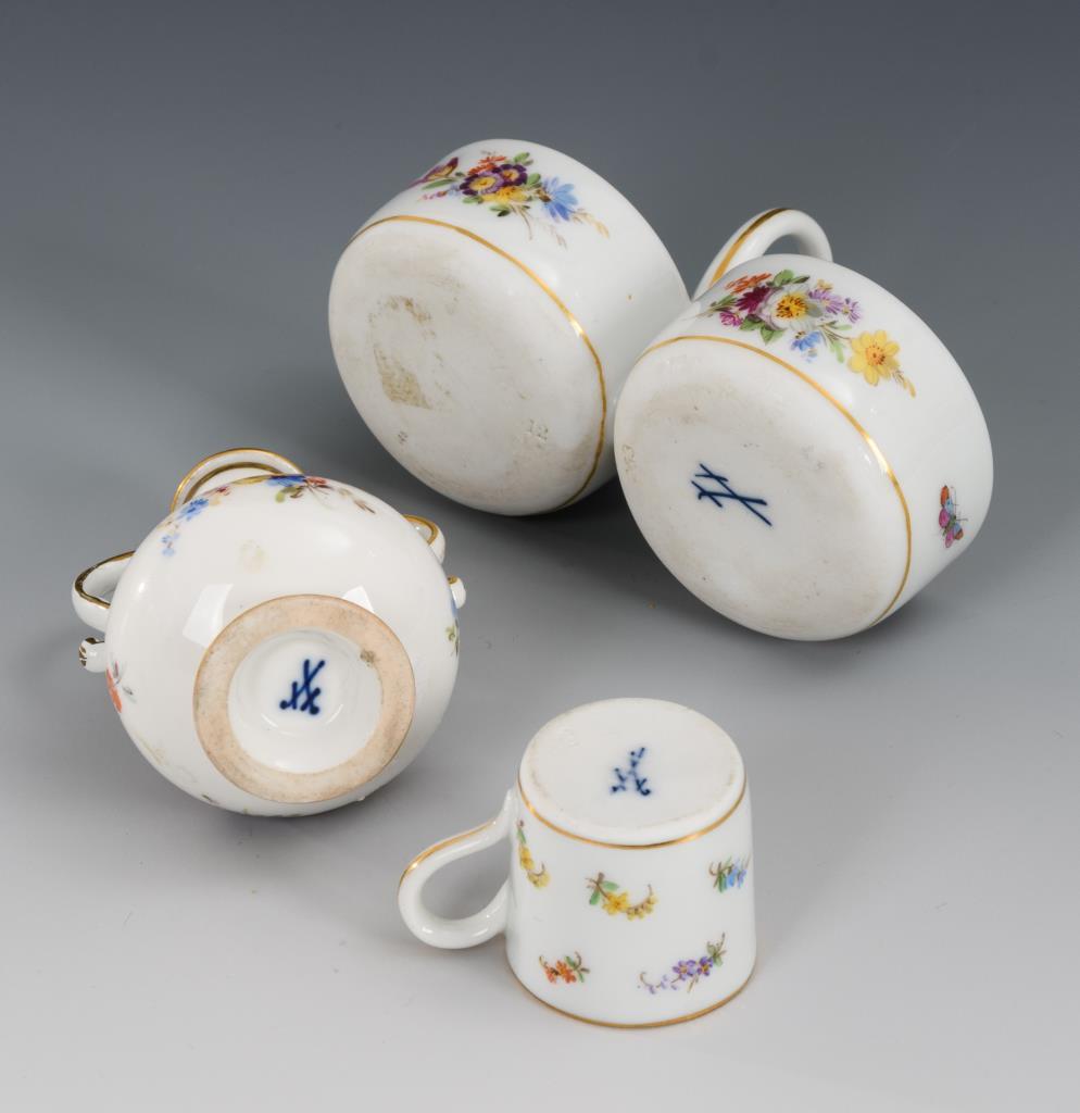 Flakon mit zwei Henkeln (H 7,5 cm), Miniaturtasse (H 3 cm) und Doppelsaliere (L 9,5 cm). Deckelknauf des Flakons bestoßen.