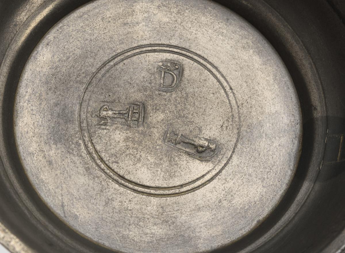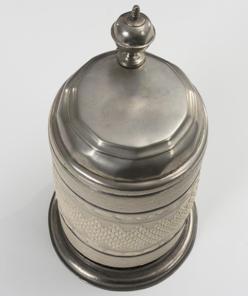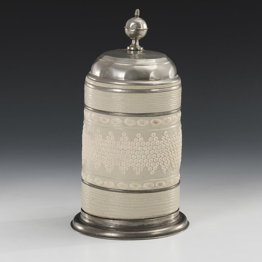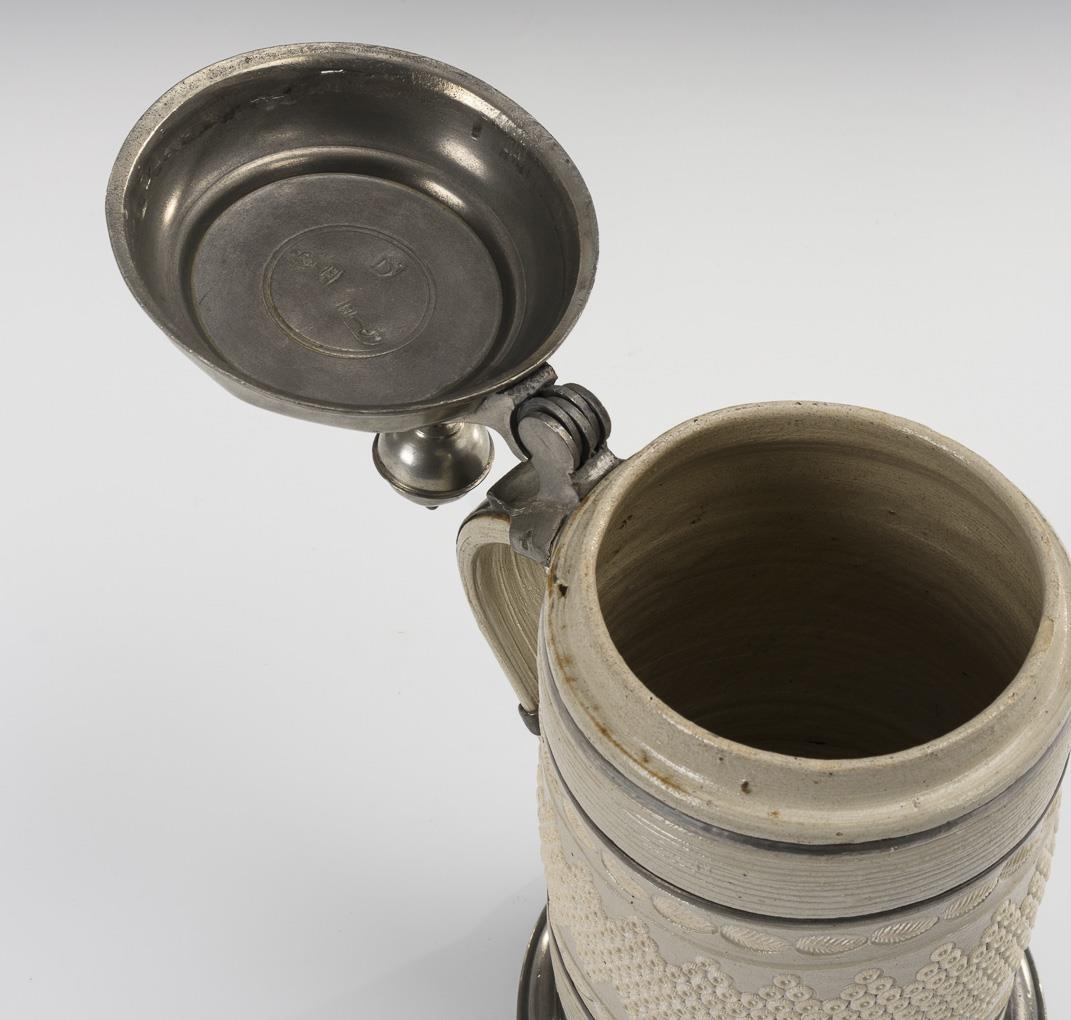 Roller jug with ribbon handle. Cross-grooved and stamped decoration with surrounding rosette frieze and foliate bands. Pewter mount with hallmarked lid, ball pusher, wall rings and handle band and pewter stand. Slight bumping to lip, pewter with signs of use, minor defects and repairs.
