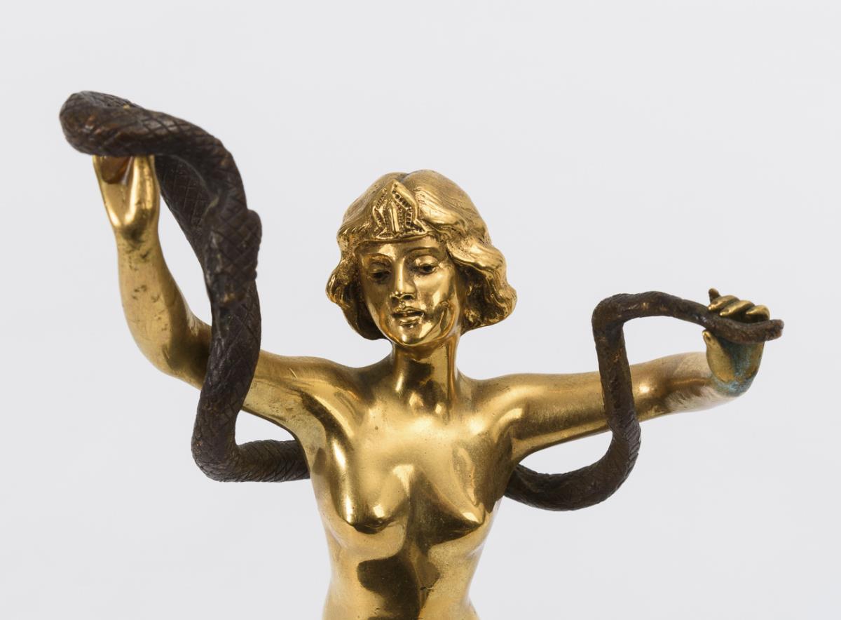 Nude of an expressive dancer holding a snake in her raised arms. Some signs of age/use.