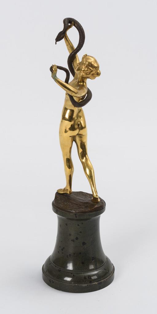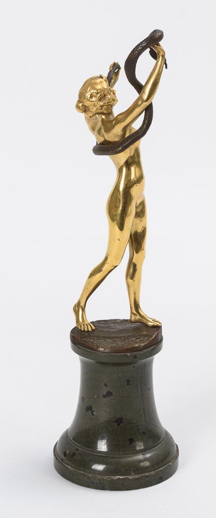 Bronze gilt, partly patinated, serpentine postament. Inscribed with addition "genuine bronze". H 25,5 / 36,5 cm.