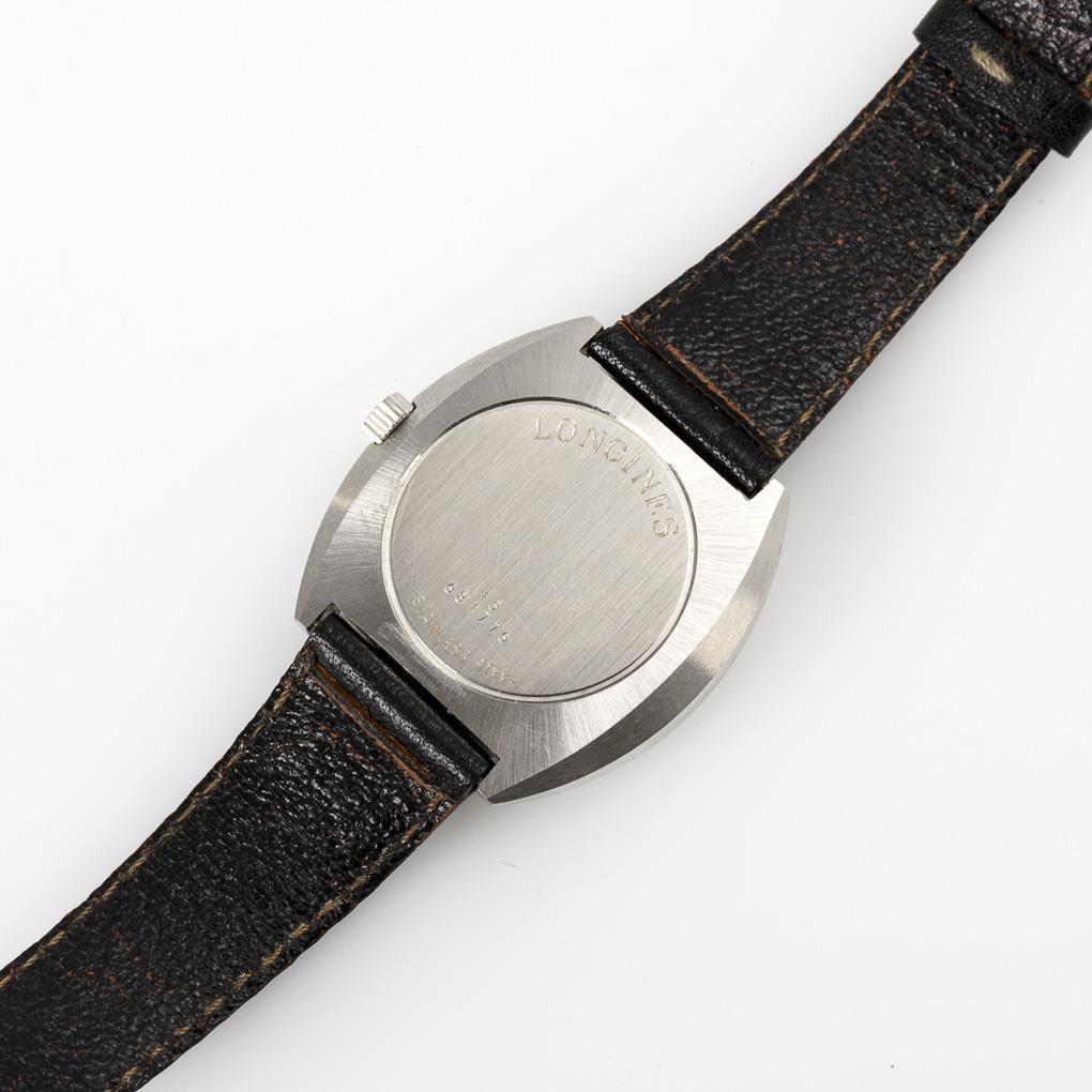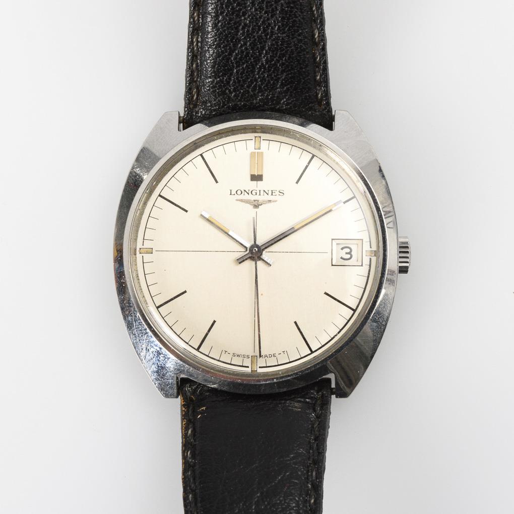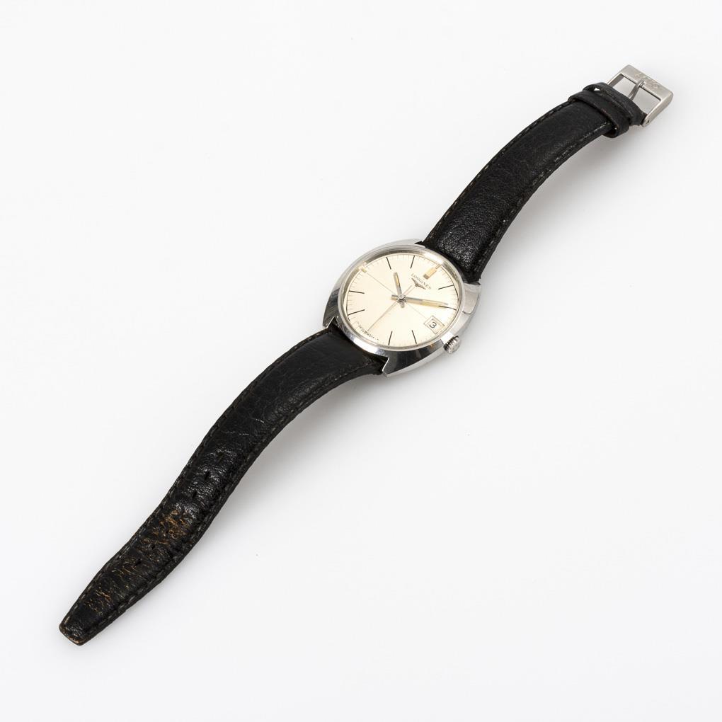 Tonneau-shaped case with silver-gray dial and hour markers, minute crown, center second hand and date display at the 3rd position. On supplemented black leather strap with pin buckle, L approx. 23 cm. Light wear marks.