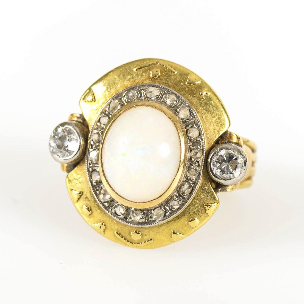 Frame-set opal cabochon, 2 old-cut diamonds, and small inset rose diamonds, between