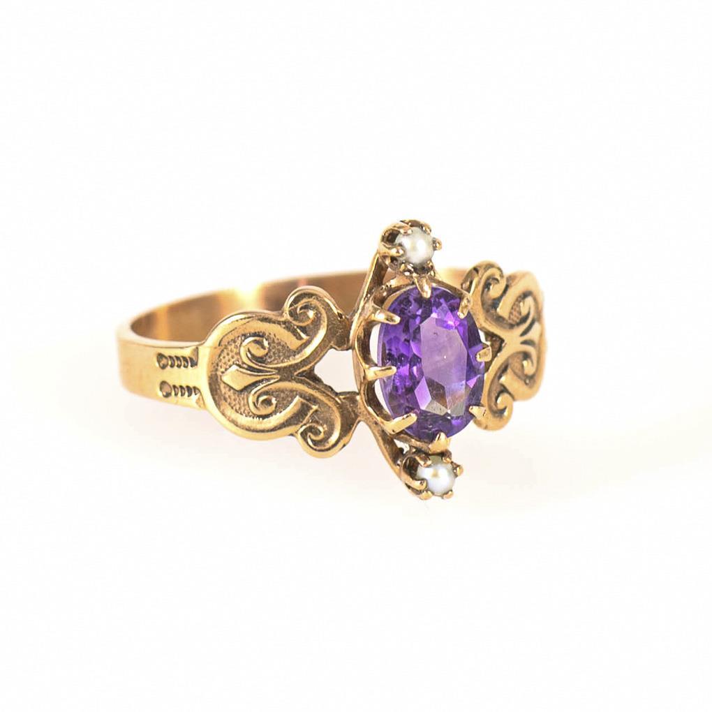 Ring with amethyst and pearl around 1900.
